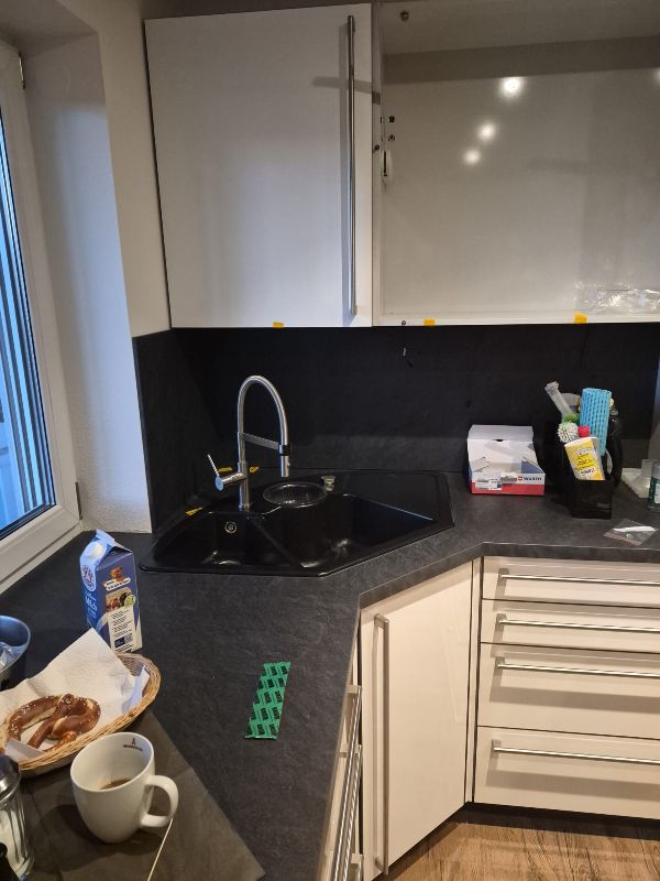 Man glaubt ja, wenn die Küche schon mal aufgebaut war, kann es keine Probleme geben, sie wieder aufzustellen. Im Prinzip stimmt das ja auch, aber die Transporteure der Einlagerungsfirma waren nicht ganz so sorgfältig beim Transport, so dass Beschläge ausgewechselt werden mussten, die es nicht mehr so gab, nur die Nachfolgermodelle.