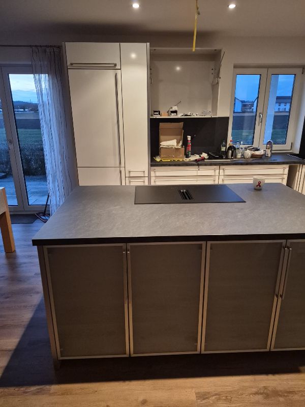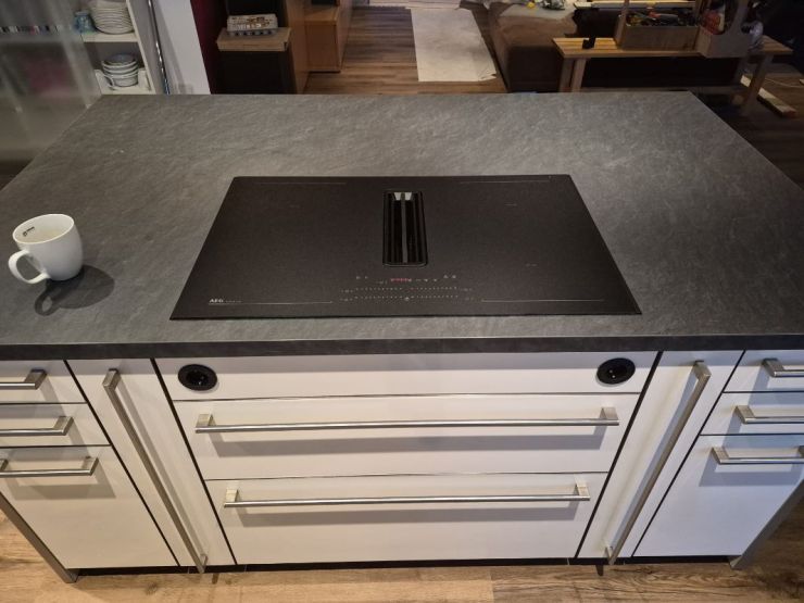 Der Kunde wollte jedoch keinen hängenden Abzug über der Insel, sondern den neuen AEG Muldenlüfter mit den SaphirMatt® Induktionskochfeldern. War zwar auch kein Problem, aber die Abluftführung kam erst Wochen später, obwohl ich den Kunden darauf hingewiesen hatte, dass Abluftführungen nach unten nicht im Lieferumfang des Kochfeldes mit dabei sind. Bei keinem Hersteller, sei es Bora, Siemens, Bosch, Miele oder eben AEG.