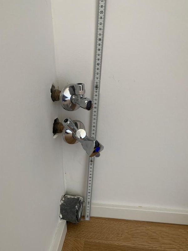 Anschlußhähne in Reih und Glied aber senkrecht. Kaltwasseranschluß schräg verdreht zu nah an der Mauer, so dass sich kein Druckschlauch mit Aquastop anschließen lässt.