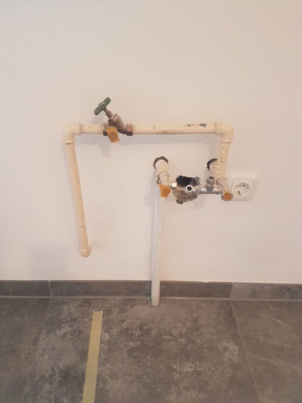 Das spottet jeder Beschreibung, Abflußrohr verbaut, Absperrhähne ragen zu weit aus der Mauer, Kaltwasseranschluß nicht normgerecht.